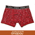 | 【デザイン】 | anapauのバンダナ柄ボクサーパンツです。高品質なストレッチ素材の世界的ブランドのLYCRAを使用し体にしっかりフィットして美しいラインを魅せてくれるボクサーパンツです。繊細な股部には一般的なオーバーからの縫い合せでなく、直接フラットシーマで縫い合わせる事によって、限りなくフラットに近い縫製を施しています。ローライズながらも若干ゆとりのある股上、股下も短過ぎないように、日本人体型向けにデザインされています。 |